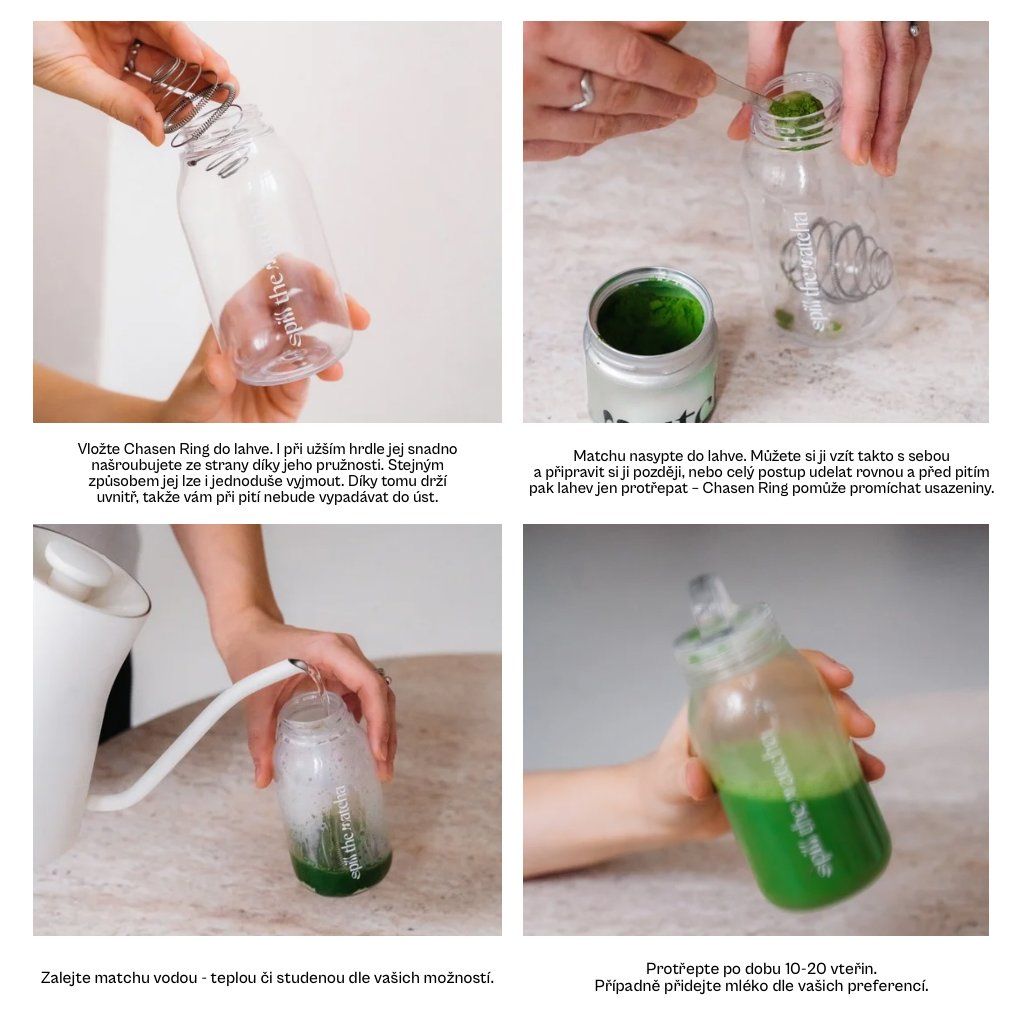 Stačí vložit Chasen Ring® do lahve, přidat matchu a vodu a protřepat 10-20 vteřin. Kvalitní matchu si tak připravíte kdekoliv – doma, v práci i na cestách.