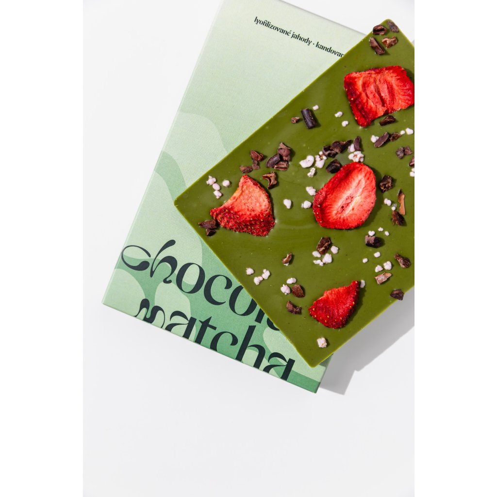 Matcha Čokoláda – Lyofilizované jahody, Kandované růže & Kakaové nibsy